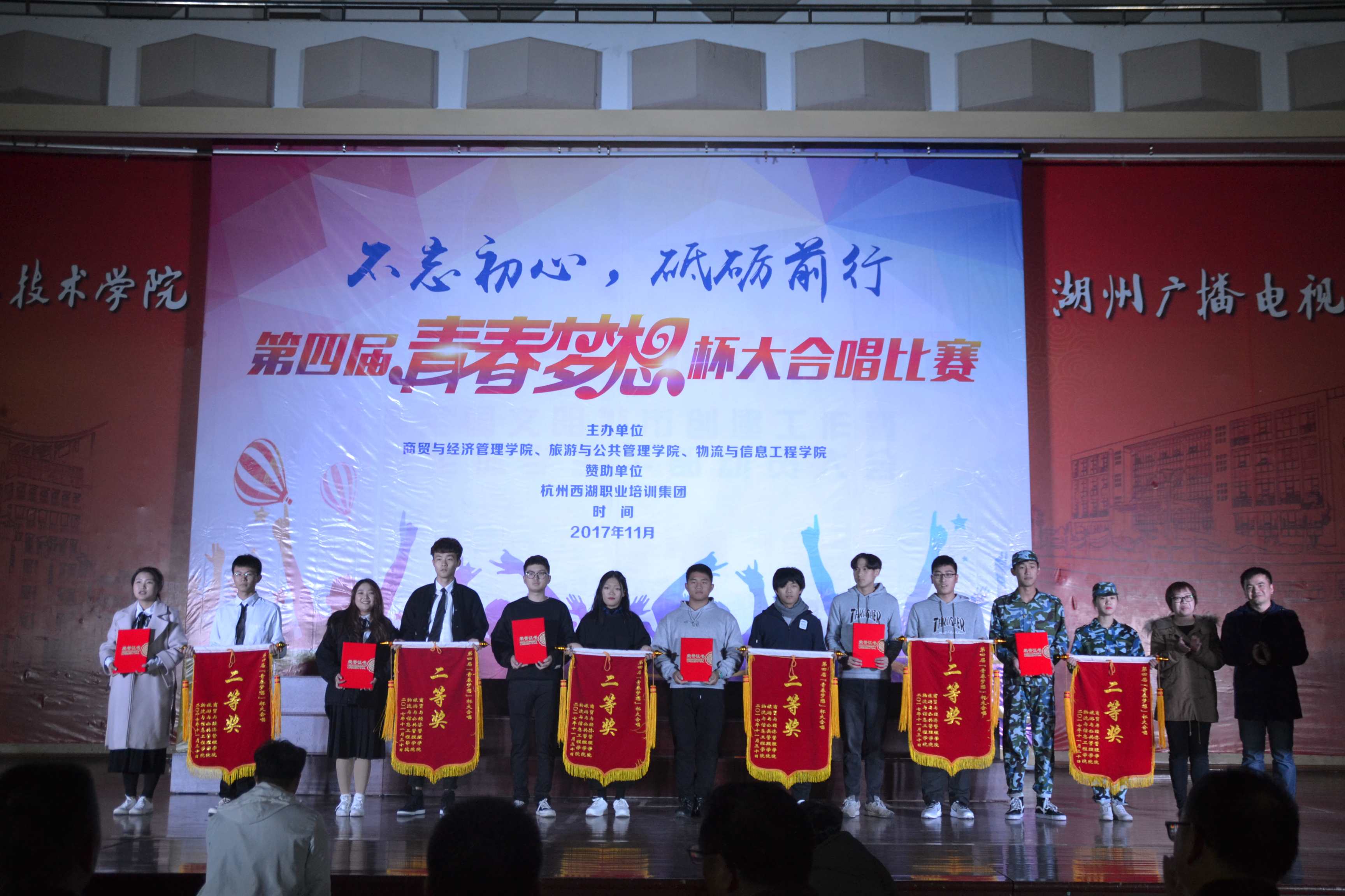 大合唱决赛在主持人献辞中正式开始,十五个参加决赛的班级服装整齐,精神饱满,歌声嘹亮,上下场队列有序。比赛精彩纷呈,充分表达出新生爱国的火热情怀及朝气蓬勃的状态,唱响了拼搏奋进的时代主旋律,赢得了评委及现场观众的热烈掌声。比赛中,参赛同学在台上深情演唱,现场的同学们也为各自的学院呐喊助威,场面火爆。最后经过专业评委的现场打分,电商1704、旅游1701、物流1701获得一等奖,人力1701、旅游1703、电商1703、国贸1701、物流1704、连锁1701等六个班级获得二等奖,文秘1702、电商1702、物流1702、商英1702、会计1702、连锁1702等六个班级获得三等奖,并由校领导为获奖班级颁奖。