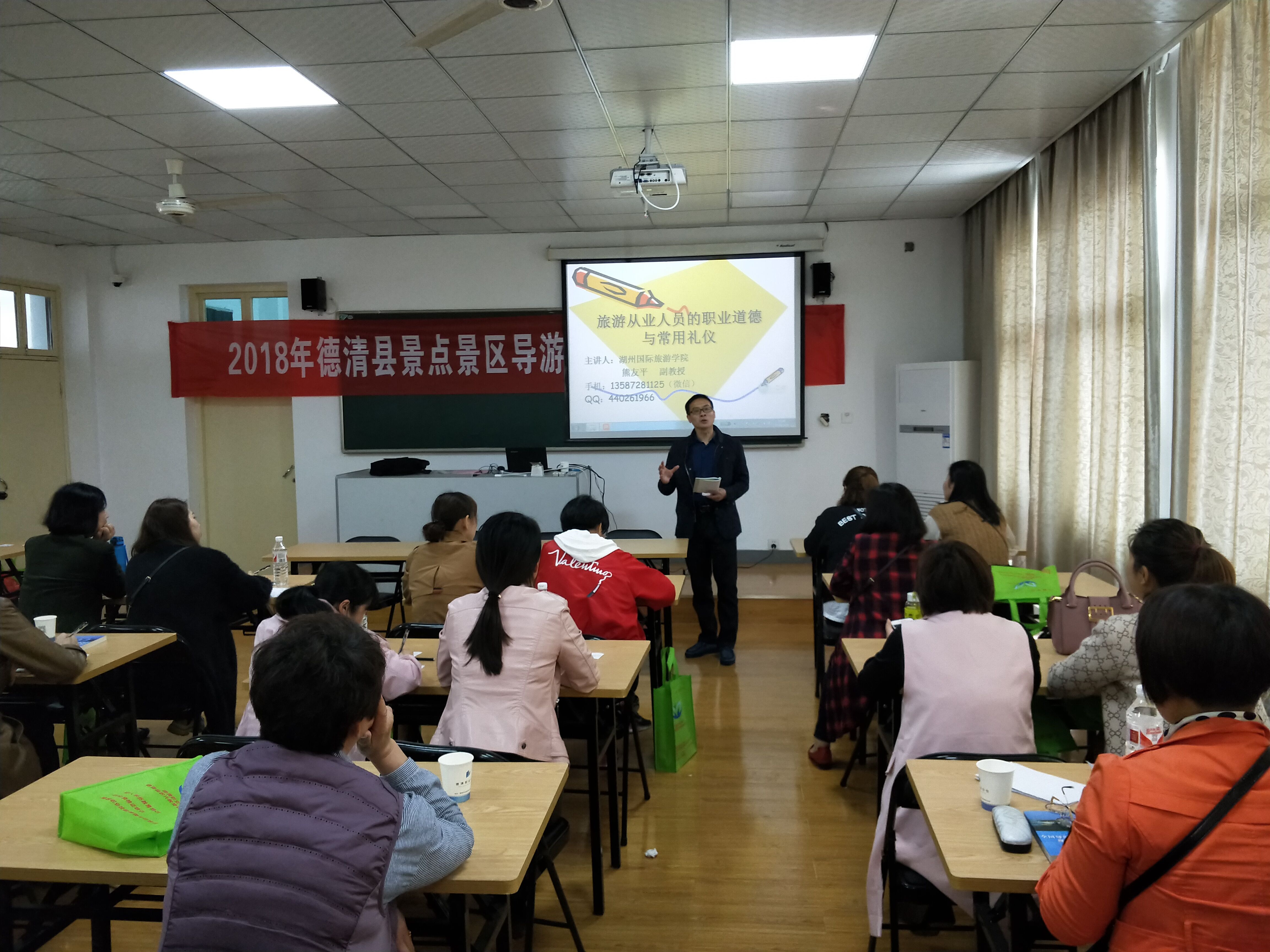 应德清县旅委邀请,湖州国际旅游学院专门组织学院专家前往德清授课,根据培训安排,在接下来的三天时间里,湖州国际旅游学院除安排学院自己的专家讲课外,还特别邀请了来自湖州市旅游企业的专家进行授课,让学员更清楚的了解到旅游行业对一线工作人员的素质要求,能够更设身处地的把握自身职业生涯的努力方向。培训最后还将安排学员进行笔试和面试的现场考核,以检验学员的培训成果,达到预期的培训目标。