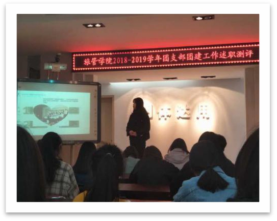 在本次报告会上,各班团支书依次上台作述职报告,通过叙述他们在过去一年团建活动的状况、介绍各自团支部在各个方面的团建活动中取得的成绩,使在座老师及同学们认识到在学习方面,每个团支部中的每一个成员都很努力学习;在生活方面,各个同学积极参与、互相配合、团结一心。各班级都获得各类奖项,这充分体现了团结的重要性,也体现了班级凝聚力重要性。