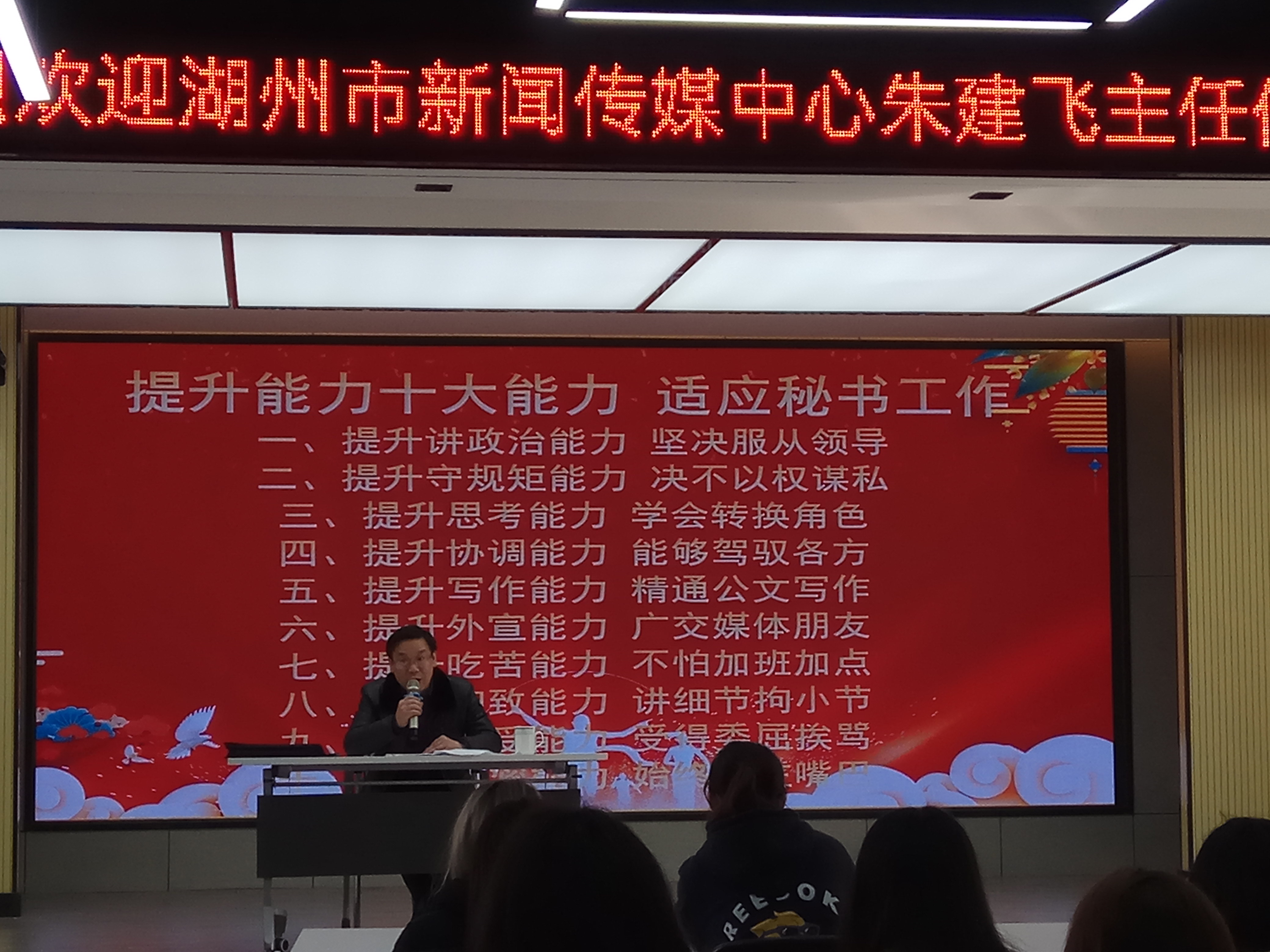 朱建飞主任结合自身工作经历和工作中生动案例,向同学们分享了他多年从事文秘岗位的宝贵经验与感想,并总结了做好文秘工作需要提升的十大能力。最后他对即将步入职场的同学们建议:坚定的政治信念、扎实写作能力,灵活的协调能力以及吃苦耐劳精神,都是今后步入社会能够胜任工作并走向成功的基石。
