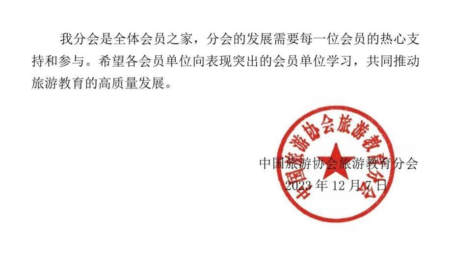2023年12月7日,中国旅游协会旅游教育分会2023年度优秀会员单位正式出炉,湖州职业技术学院旅游管理学院从913家会员单位中脱颖而出,荣获2023年度优秀会员单位。