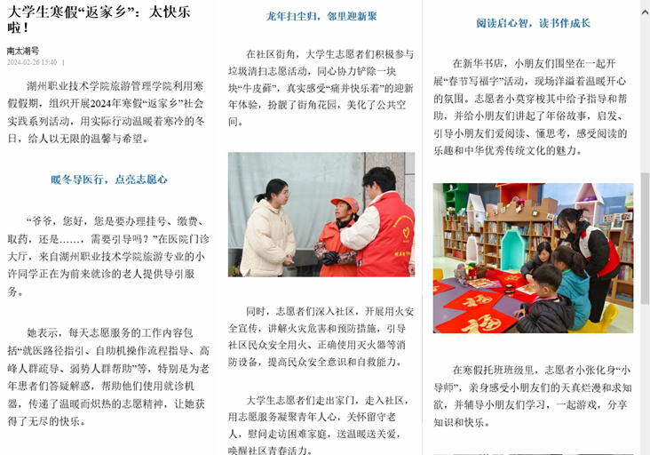 2024年2月26日《南太湖号》报道了我校旅游管理学院大学生寒假社会实践活动的相关新闻。