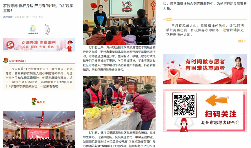 2024年3月5日《志愿湖州》报道了我校学雷锋志愿活动的相关新闻。