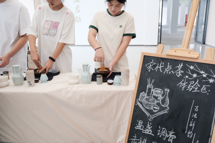 在“特饮创意站·茶韵新潮”区域,各式调饮材料和装饰品一应俱全。同学们可以亲自动手,或体验传统点茶技艺,或创作个性十足的特色饮品。这个环节不仅锻炼了学生的实践能力,更展现了传统茶文化在现代生活中的创新应用。